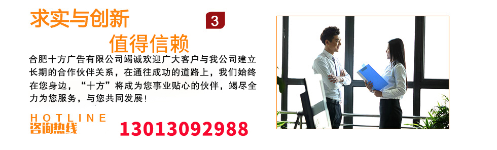 合肥十方廣告有限公司成立于2014年,是一家擁有良好行業口碑的廣告標識機構。我們的宗旨是“凝聚現代智慧、創作標識精品”。我們用我們的專業為客戶打造優質的廣告標識產品??蛻舻臐M意就是我們的動力。合肥十方廣告有限公司是一家實力雄厚,集廣告設計、制作及安裝;鋼結構制作、安裝;城市及道路照明設施設計、制作及安裝;標識、標牌設計制作、安裝;LED顯示屏制作、安裝及維護;廣告字牌設計、制作及安裝;燈箱制作及安裝;雕塑設計、制作及安裝等。在廣告界享有一定的知名度,也在廣大客戶中樹立了良好的口碑。我們的銷售及服務團隊都是由資深的行內專業人員及接受過嚴格培訓的技術人員...更多>